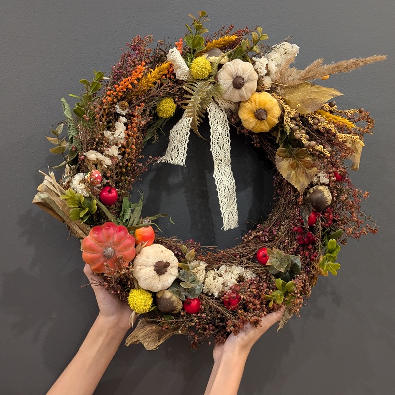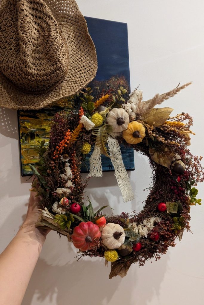 Inspirując się barwami jesieni czyli głównie żółtym, brązowym, pomarańczowym, wykonałam wianek z dodatkiem dyń, grzybów, liści. Właściwie powstał on wczoraj przez przypadek dlatego, że jest pilnie potrzebny przed przyjazdem gościa (do kogoś z mojej rodziny). Ma być dopełnieniem jesiennej dekoracji w domu, pomóc celebrować jesień.