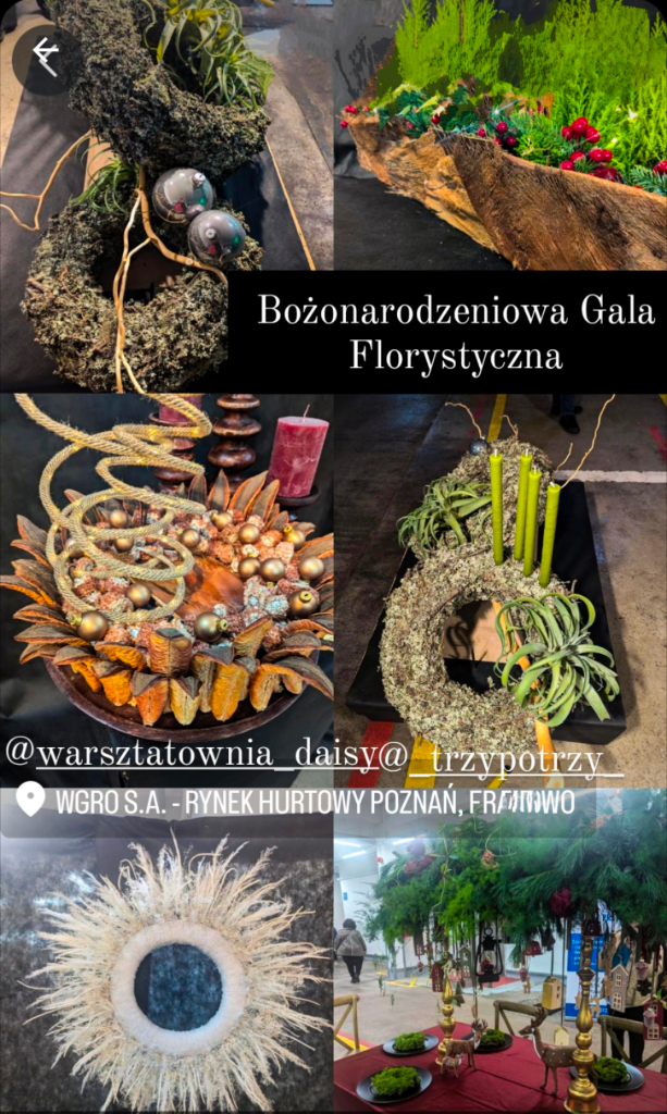 17 listopada 2024 koleżanka (właścicielka kwiaciarni) zabrała mnie na Franowo, gdzie odbywała się przez weekend Bożonarodzeniowa Gala Florystyczna. Poza kompozycjami zaprezentowanymi przez florystów, udało nam się kupić świetne ozdoby i rośliny do tworzenia dekoracji świątecznych. Taka tradycyjna forma robienia zakupów jest w tym przypadku o tyle dobra, że mam możliwość sprawdzenia danego produktu, koloru, faktury i nie kupuję kota w worku. Podpisuję się później pod moimi pracami, dlatego zależy mi na ich jakości i niepowtarzalnym wyglądzie. Na szczęście do Świąt jeszcze czas i mogę poświęcić na przygotowania więcej chwil niż w grudniu. Z tego, co zauważyłam podczas Gali Bożonarodzeniowej, to w tym roku jeszcze bardziej idziemy w stronę natury, minimalizmu, niż w 2023 roku. Dominuje zieleń, brąz i im mniej tym lepiej. Jest wielu zwolenników takich naturalnych wieńców, stroików, ale nie brakuje też tych, którzy jednak kochają tradycyjne kolory Świąt – czerwień, złoty, biel, srebro i światełka. Wszystko zależy od upodobań.