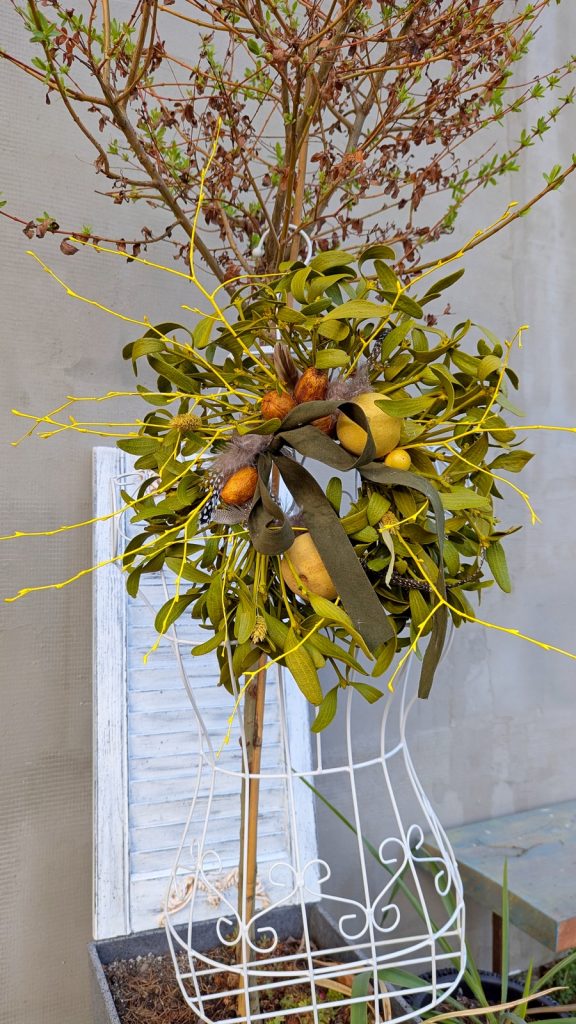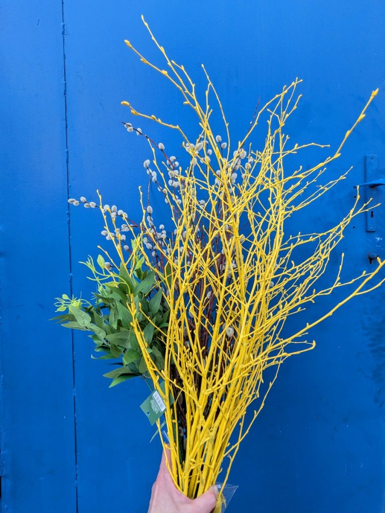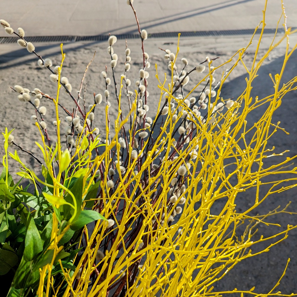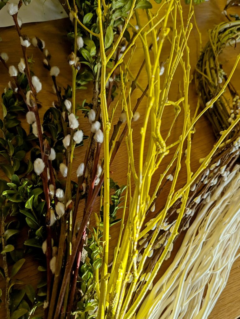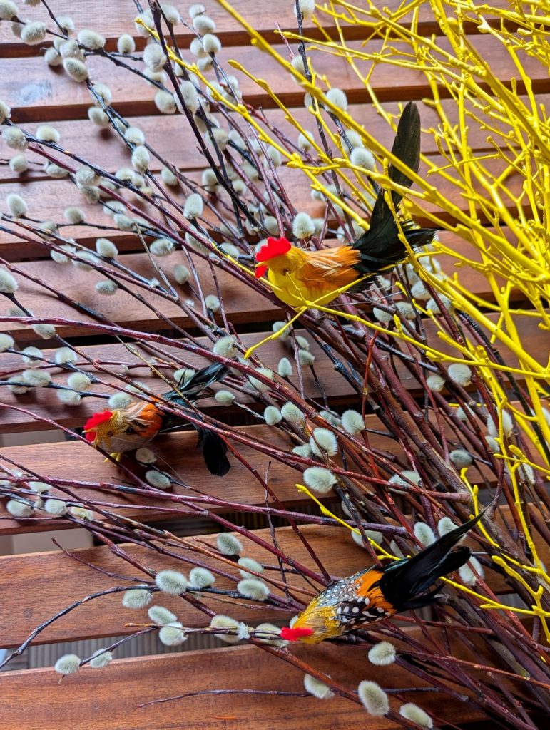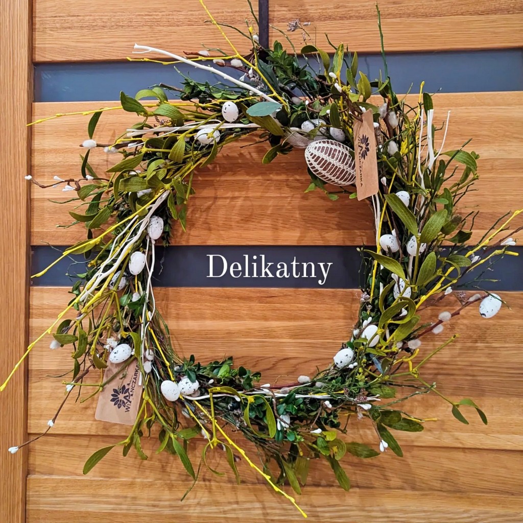 Lada dzień Wielkanoc, o czym przypomina nam już nie tylko kalendarz i przepiękna aura za oknem (dziś 27 stopni – szok!), ale również wiosenne wystawy sklepowe, zajączki, kurczaki i jajka w oknach. Do tego baranki z masła, mazurki, babeczki do święconki. W ogrodach kwiaty są już w pełnym rozkwicie, a podczas spacerów widzę, że ludzie mają już pierwsze koszenie trawnika za sobą. Tata wczoraj też wspominał, że dziś ma zamiar skosić trawę po zimie. Z tego co wiem to przyciął już pędy winogron. Mnie akurat forsycja i bukszpan najbardziej przypominają o tym, że zbliża się to ważne dla mnie święto. Wczoraj po północy robiłam jeszcze stroiki na groby bliskich i w prezencie dla rodziców, taki do postawienia na stół. Wianków typowo wielkanocnych też zrobiłam kilka. Jeden tradycyjnie do pracy.